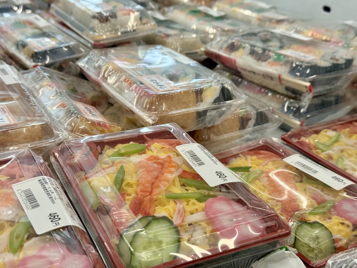 巻き寿司やちらし寿司のパッケージがワゴン一杯に。1日で400個が完売する日もあるとか。