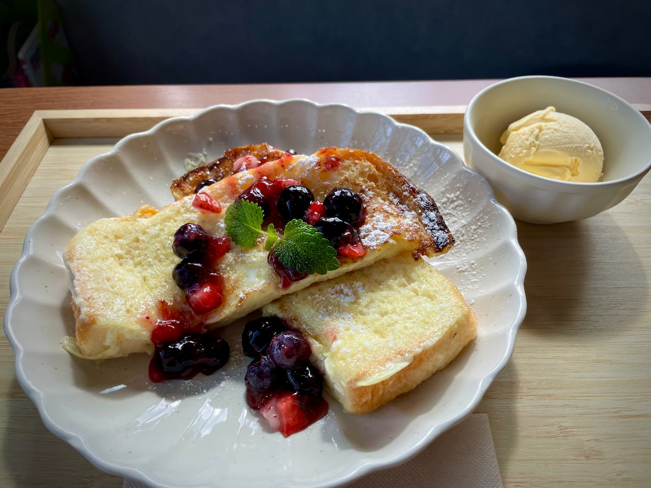 パンはしっとり&やわらか。甘さ控えめで、ミルクと玉子のやさしい風味が口の中に広がります。バニラアイスを上に乗せると、濃厚な甘さとベリーの甘酸っぱさが加わって◎!ナイフとフォークが止まらず、どんどん食べ進めてあっという間に完食!
