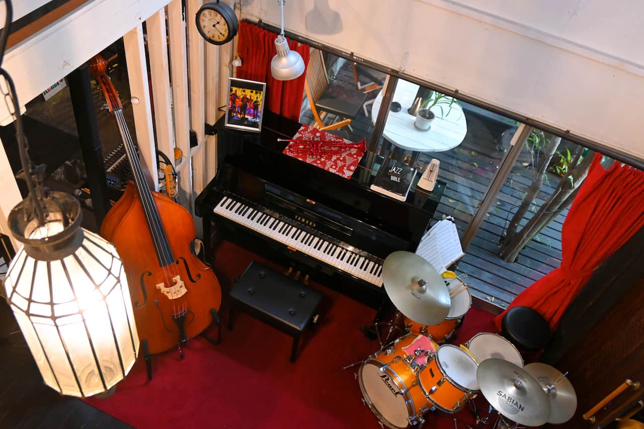 カウンターの背後には、ピアノやドラム、ウッドベース。空間の一部として自然に溶け込んだ小さなステージが姿を見せます。
