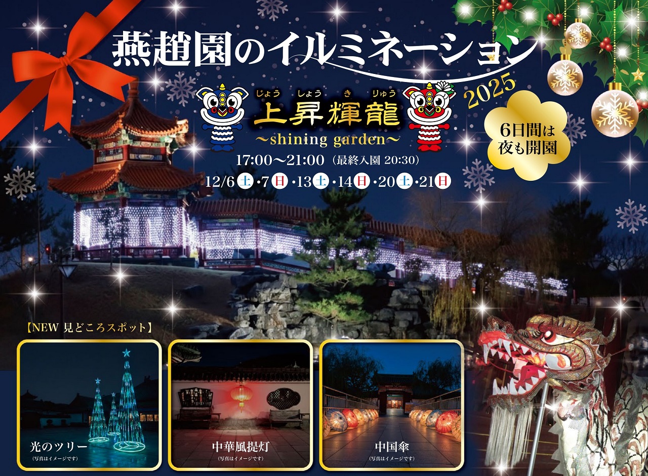 | ざっくり内容 | 12月6~21日までの土・日曜の6日間限定で「燕趙園イルミネーション」を開催。 12月7日10~15時は「響の森ワークショップ」、12月20・21日10時・13時は「お菓子の詰め放題」、12月1日~1月31日の10~16時は「つばめカフェ営業」が行われます。 |