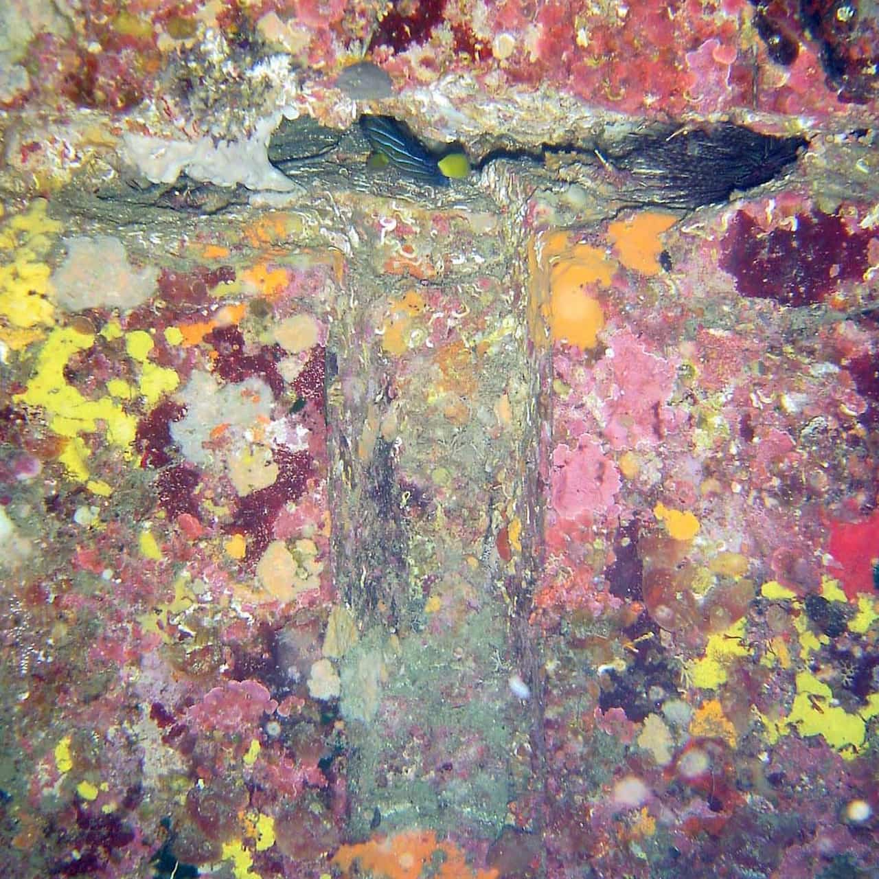 水深約30メートルの海底には、祭祀跡のような場所があります。その後ろの壁には、人工的に削られた跡も。