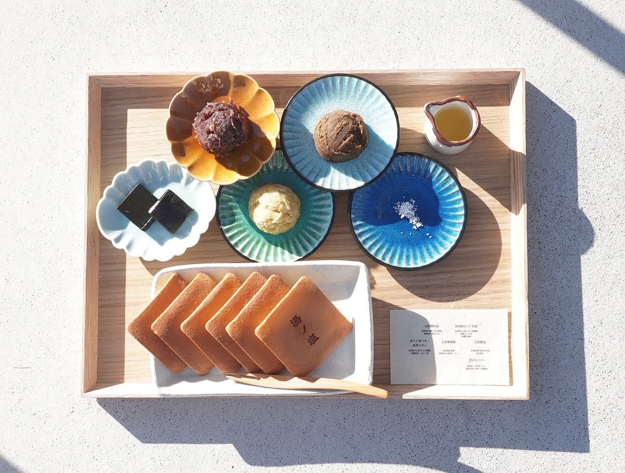 と、ほうじ茶・抹茶・焦がしの3種のバター、そして塩。これらはすべて鳥取県産の食材で作られています。