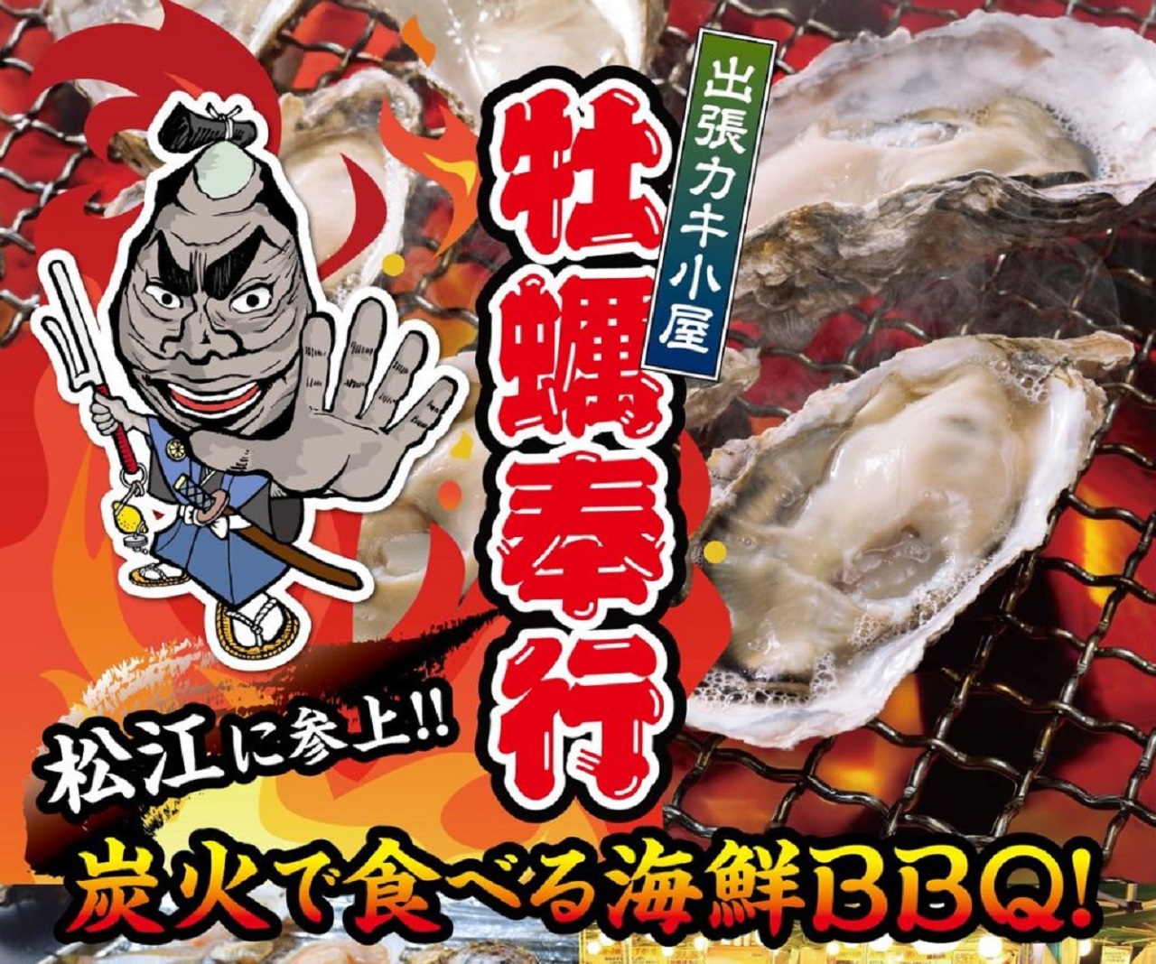 松江市『イオン松江ショッピングセンター』に、出張カキ小屋『牡蠣奉行(かきぶぎょう)』が期間限定でやってきます。宮城県産の殻付きカキを、備長炭の炭火で自分で焼いて楽しめるセルフBBQイベント。