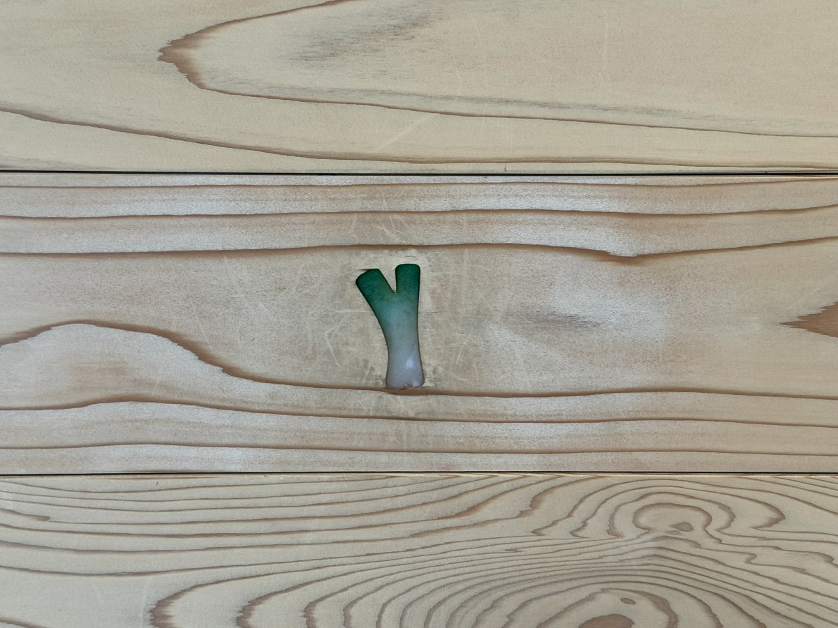 米子市のYとネギをモチーフにしたヨネギーズ。キャラクターをかたどった埋め木が、全部で4ヶ所あるらしい。