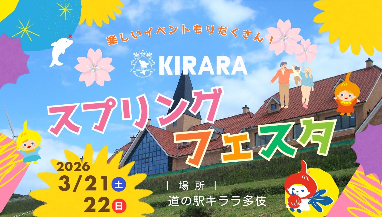 | ざっくり内容 | 道の駅に隠れている「かくれんぼトントゥ」を探して景品がもらえるスタンプラリー、 海をバックにシャボン玉をとばすイベントなど、家族で楽しめる企画が盛りだくさん!さらに、キララグループ各施設で合計3000円以上買い物をすると「お菓子のつかみ取り」にもチャレンジできます。 会場では、グルメや雑貨など、様々なお店が集まる「KIRARAマルシェ」も開催。さらに3/22限定で、先着100名にキララベーカリーの「チョコボール」をプレゼント。 |