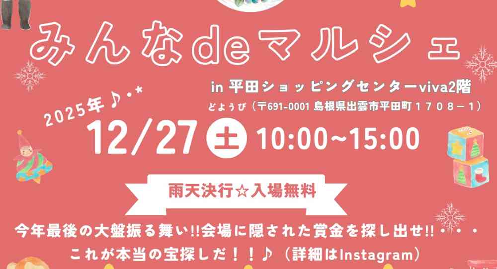 【出雲市・雲南市周辺】12/27(土)・28(日)のイベントまとめ。『viva』で宝探し、ゴビウス企画…