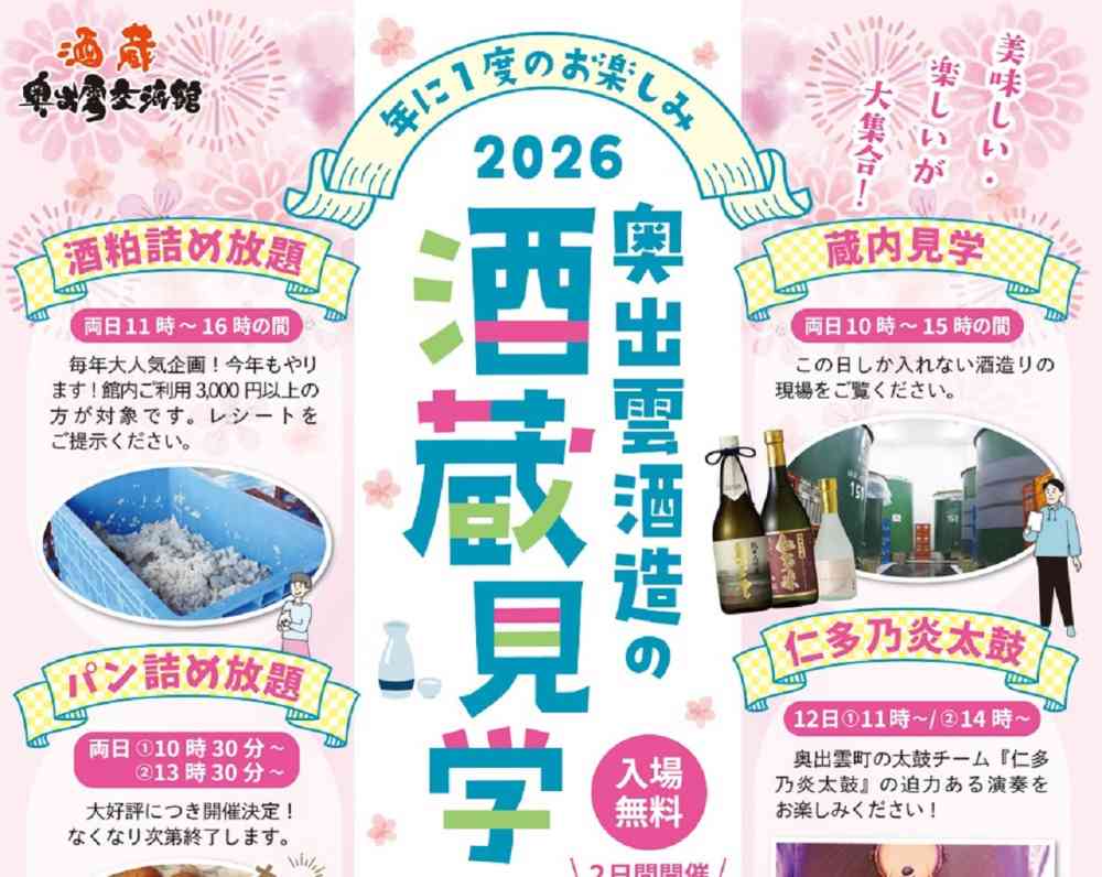 【出雲・雲南周辺】4/11(土)・12(日)のイベントまとめ。酒かす詰め放題!?酒蔵見学、チューリ…