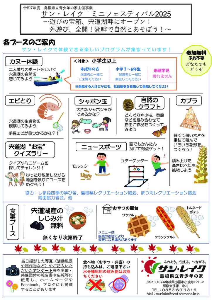島根県立青少年の家サン・レイクでは体験活動ブース、食事ブースを準備。サン・レイクミニフェスティバルを楽しんで!
