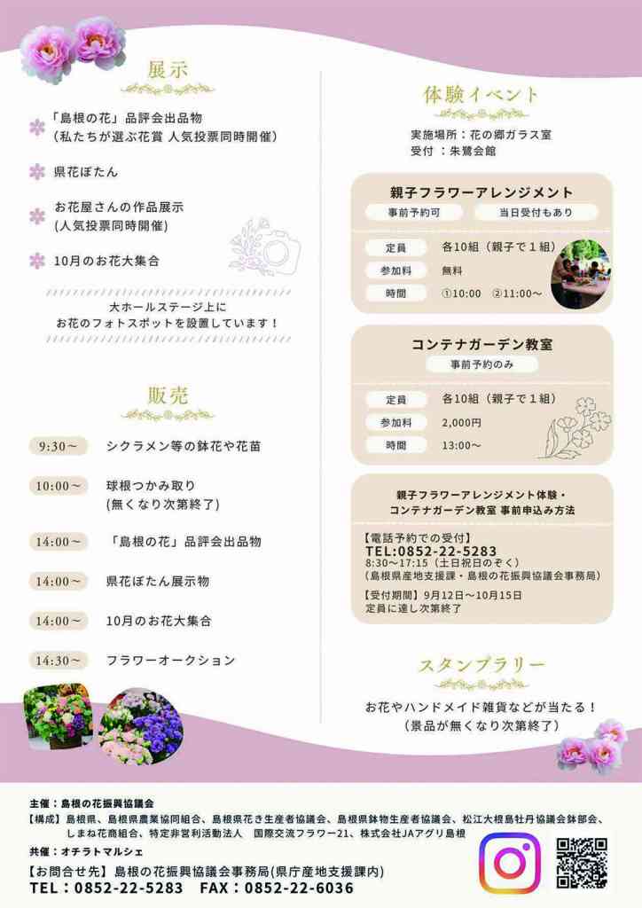 「島根の花」品評会に出品されたお花や、県花ぼたんなどの展示・販売、お花屋さんがつくるフラワーアレンジメント作品の展示、体験イベントなどを行う。