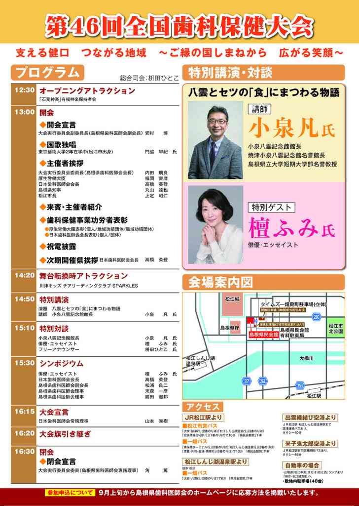 第46回全国歯科保健大会が島根県にて開催。大会テーマは「支える健口 つながる地域 ~ご縁の里しまねから 広がる笑顔~」。歯科保健事業功労者表彰や、2025年度後期連続テレビ小説「ばけばけ」にちなみ、八雲記念館館長 小泉凡氏による特別講演、また特別ゲストには檀ふみ氏が登壇予定。