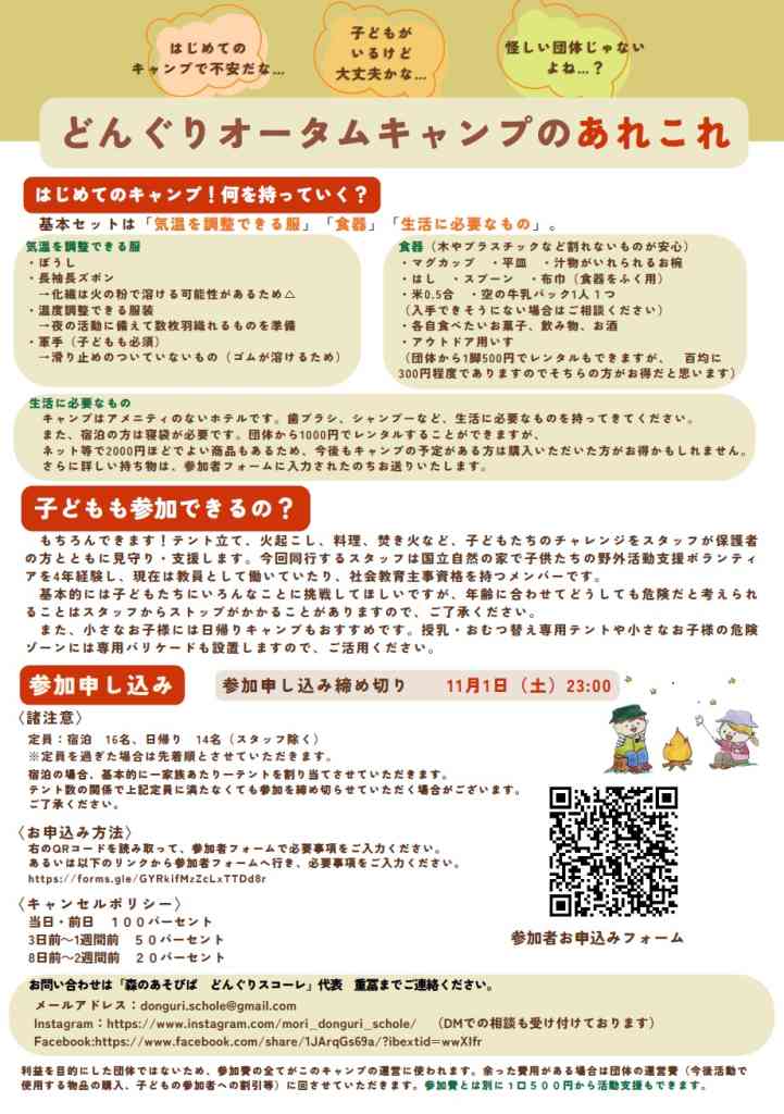 備考 | 休み:雨天決行 問合せ:メール(donguri.schole@gmail.com)にて受付 その他:中学生以下は要保護者同伴 |