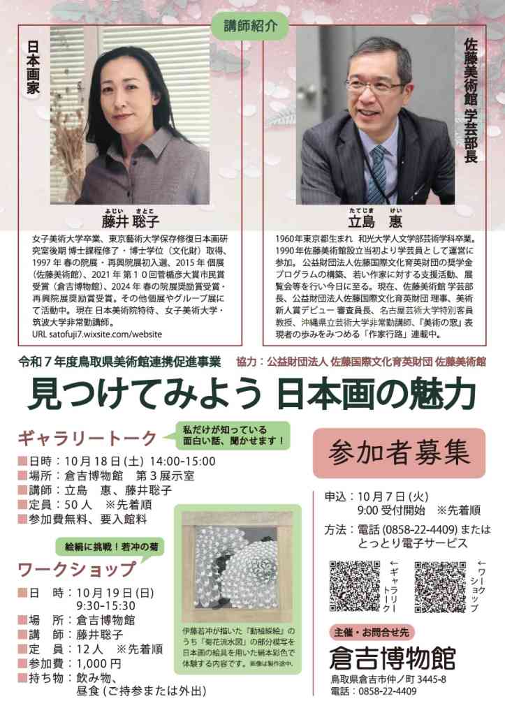 江戸絵画を中心とした日本画作品を展示する鳥取県立美術館「The 花鳥画展」にあわせて、倉吉博物館では現代日本画を紹介する展示を行う。
