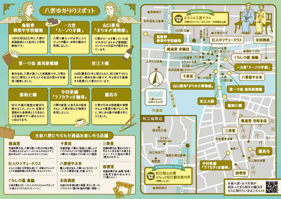 | 備考 | 休み:少雨決行、荒天時中止(事前中止の場合はHPにて告知。シアトリカルツアー参加者には、中止の場合、メールにて連絡) その他:「シアトリカルツアー」は定員10名(定員に満たない場合は当日受付可)。webサイト(https://www.kankou-matsue.jp/machiaruki/course/desc/?id=84)より要事前申込 |