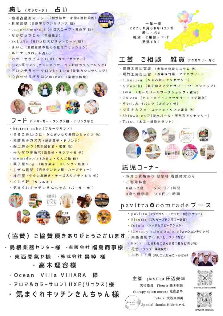 神在月にpavitra★comradeの仲間が県外からも集結。癒やし、占い、雑貨販売、フードなど、県内外から約40店舗が出店し、ここでしか出会えない、ここだから出会える特別な1日をお届け。