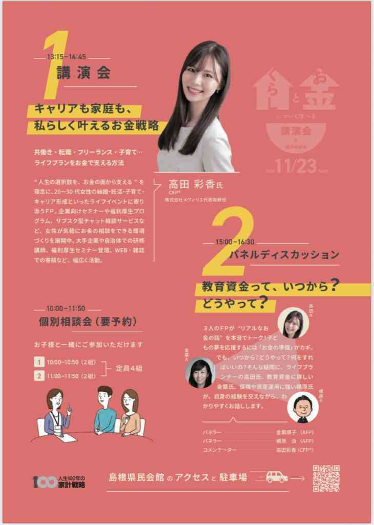 | 備考 | 休み:天候等により、イベントが中止される場合は「日本FP協会 島根支部」HPにて告知 その他:定員先着70名。HP内のフォームにて要事前申込 |