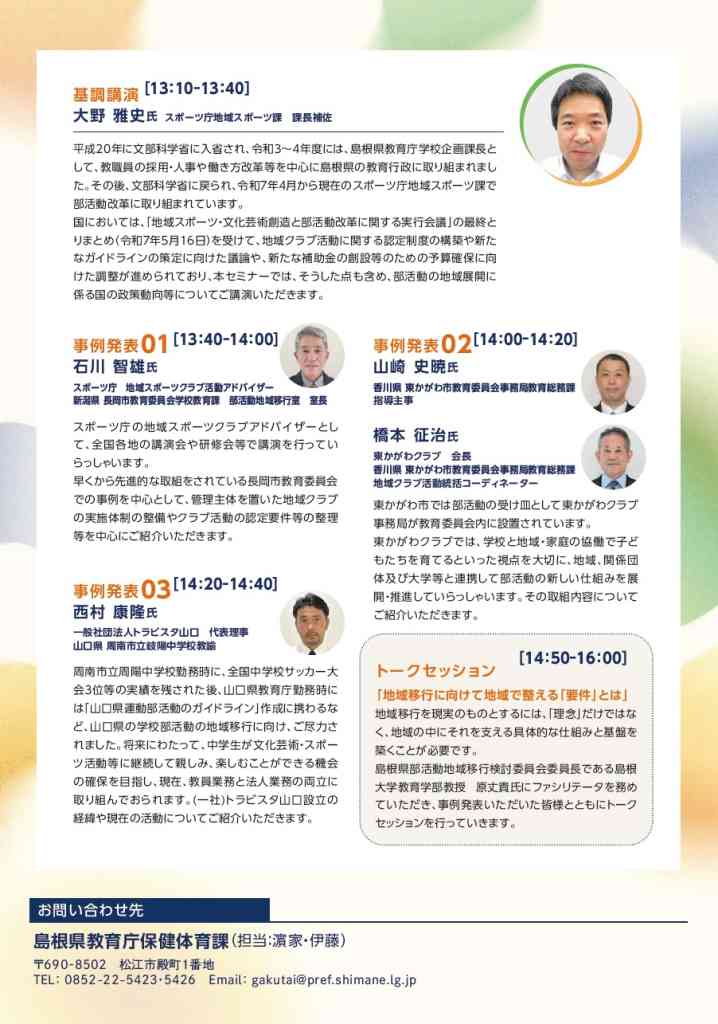 本セミナーでは、他県における先進事例の紹介を通じて、地域移行を進める上での課題や対応策への理解を深め、各市町村における取組の一層の推進を図るための機会とする。部活動の地域移行に関心のある方についても広く参加可能。