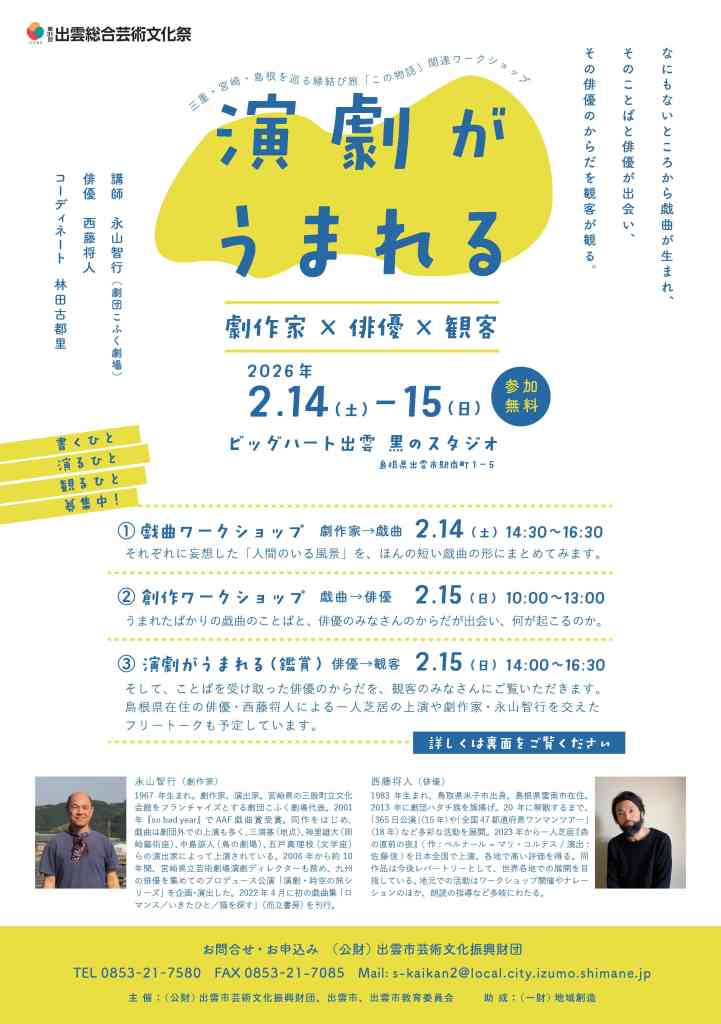 | 備考 | その他:定員「戯曲ワークショップ」「創作ワークショップ」各10名程度、対象は高校生以上 申込方法:グーグルフォーム(https://forms.gle/9rBmEVzPmokuHJ2e7)又は、メール(s-kaikan2@local.city.izumo.shimane.jp)宛てに氏名、年齢、参加希望のワークショップ、演劇経験の有無(あれば所属)、連絡先(電話番号とメールアドレス)を明記して申し込み。定員になり次第締切り |