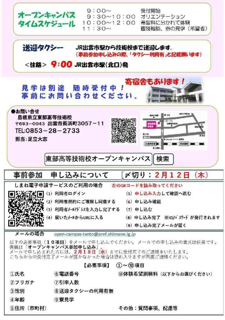 | お問い合わせ | 島根県立東部高等技術校 オープンキャンパス担当 |