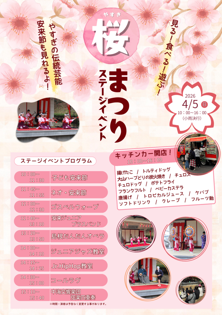 ステージイベントでは、子どもたちによる安来節をはじめ、さまざまな方が演芸を披露。キッチンカーも多数出店予定!