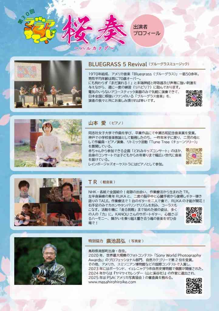 近年は「桜奏~ハルカナデ~」と称し、米子市淀江文化センターの中庭に咲く桜をバックに、地元アーティストの生演奏を聴くコンサートを実施しているが、今回は第30回を記念して、ちょっと豪華に大ホールで開催。