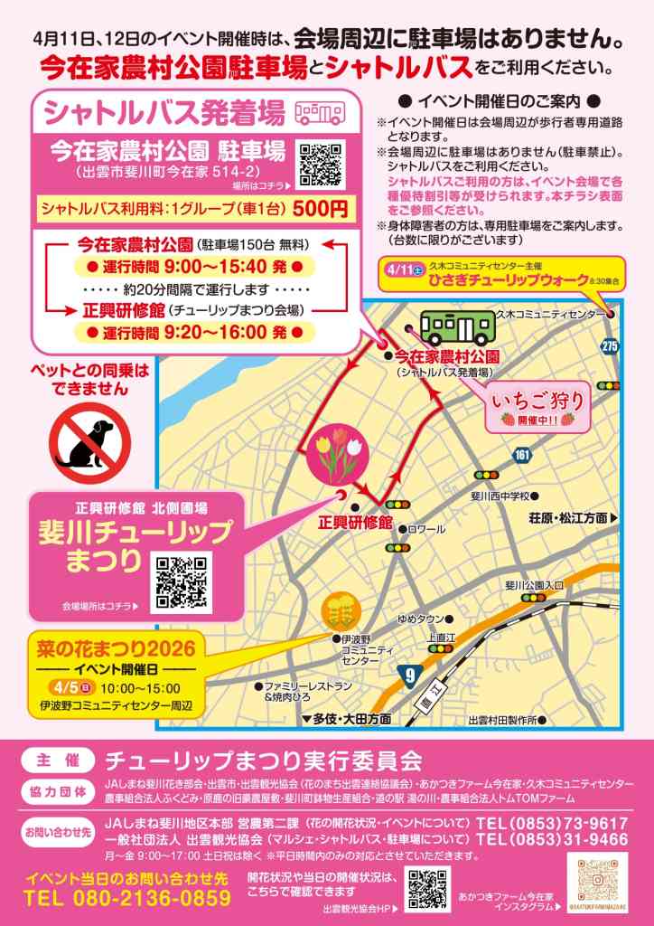| 電話 | 080-2136-0859(イベント当日の問合せ先)/0853-73-9617(JAしまね斐川地区本部 営業第二課)/0853-31-9466(出雲観光協会) |