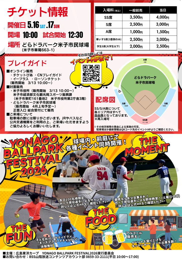 | 備考 | 休み:天候等の事由による実施の可否、駐車場の最新情報はイベントHPより要確認 チケット取扱い:【オンライン販売】チケットぴあ、CNプレイガイド、イープラス、ローソンチケット(3/13の10:00~)【対面販売】米子市役所(3/13の10:00~)第2庁舎3階 スポーツ振興課、どらドラパーク米子市民球場(4月上旬予定)正面入口 総合受付 |