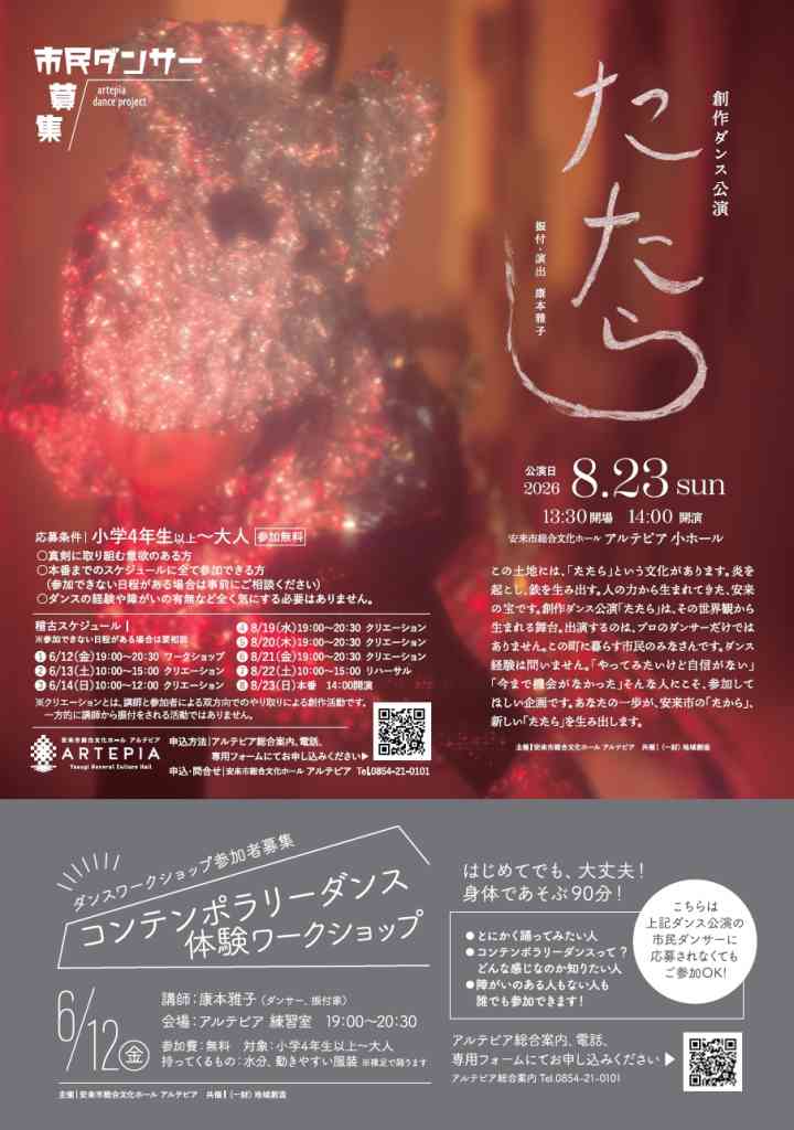 プロの振付家・ダンサー・打楽器奏者・舞台美術家と一緒にダンス公演に参加できる市民ダンサーを募集。小学4年~大人なら誰でも参加可能。稽古は6/12~6/14、8/19~8/21の6日間。8/22(土)リハーサル、8/23(日)が本番となっている。