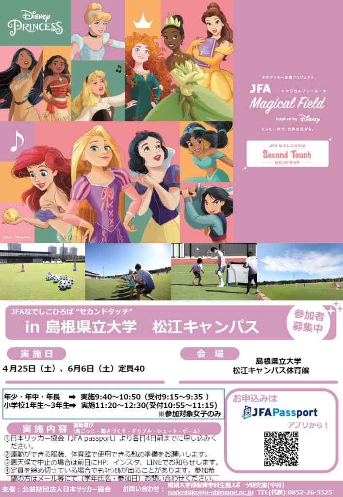| 備考 | 休み:自然災害等の理由により急遽中止する場合は、HPにて告知 持ち物:体育館で使用できる靴、飲み物 その他:定員各回40名。年少~小3女児でサッカー初心者・未経験者対象。チラシ記載のJFA公式アプリ「JFA Passport」より要事前申込 |
