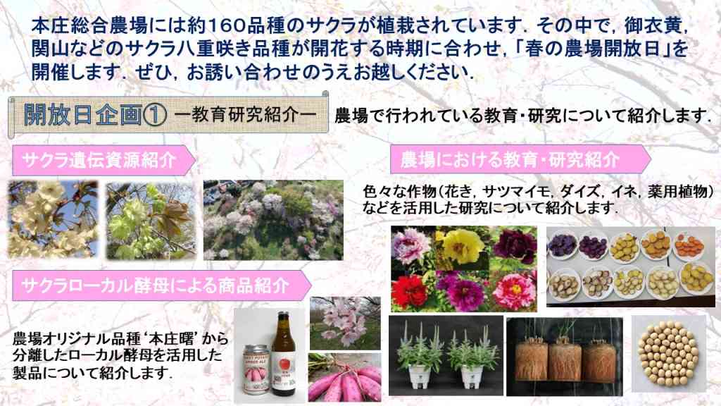 島根大学本庄総合農場では、約160品種のサクラを遺伝資源として保存・管理しており、それら豊富なサクラ品種を教育研究に活用している。その植栽されているサクラのうち、御衣黄や関山などの八重咲き品種のサクラが開花となる時期に合わせて、「春の農場開放日」を開催。