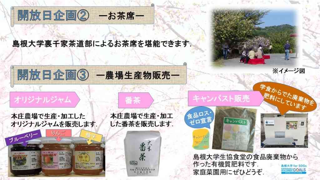 そのほか、農場生産物販売や島根大学裏千家茶道部によるお茶席も実施。歩きやすい靴・服装でお出かけして。