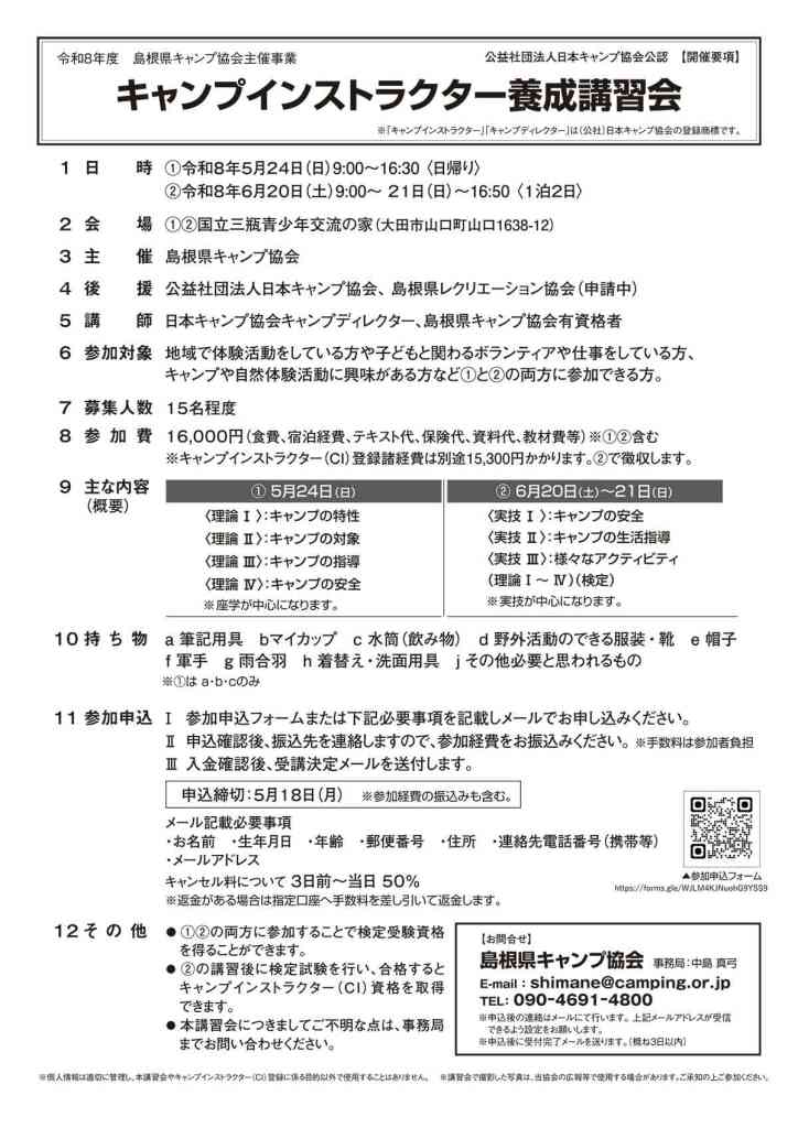 | 料金 | 参加費1万6000円(食費、宿泊経費、テキス卜代、保険代、資料代、教材費など。理論編・実技編含む)※5/18(月)までに要事前申込。キャンプインス卜ラクター登録諸経費は別途1万5300円必要 |