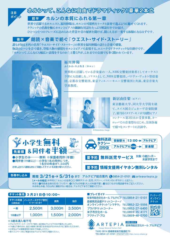 出演は福川伸陽(ホルン)と新居由佳梨(ピアノ)。演奏予定曲は、カサド「親愛の言葉」、ヒンデミット「アルトホルンソナタ」、そしてバーンスタイン「ウエスト・サイド・ストーリー」(語り付き)ほかを予定している。