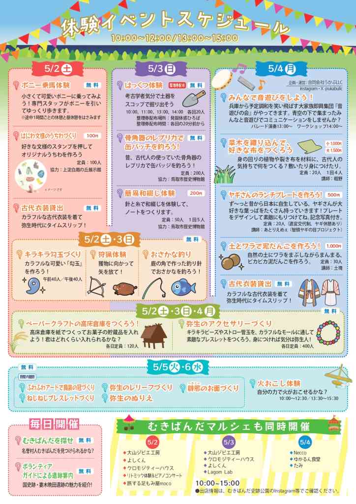 火おこし、狩猟体験、はっくつ体験、キラキラ勾玉づくりなど日替わりで楽しる。5月2日はポニー乗馬体験、5月4日は音楽にふれるワークショップ、その他大人も楽しめる体験も用意。5月2日~5月4日は美味しいものが食べられるマルシェも同時開催!